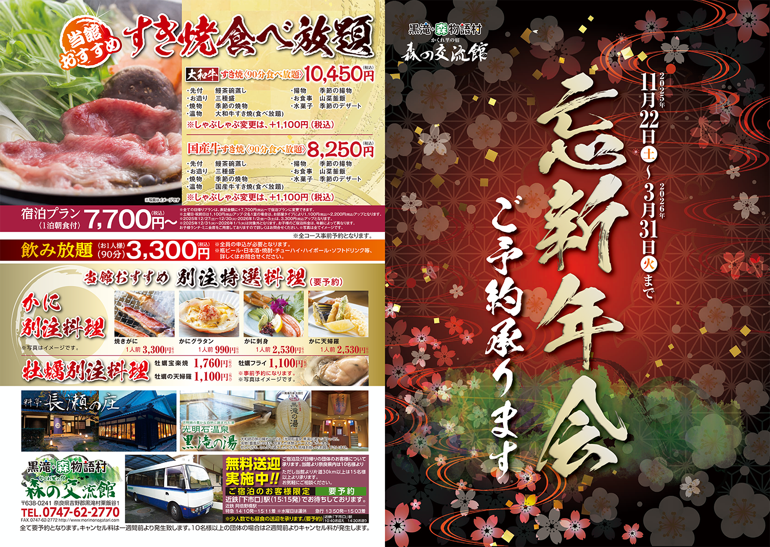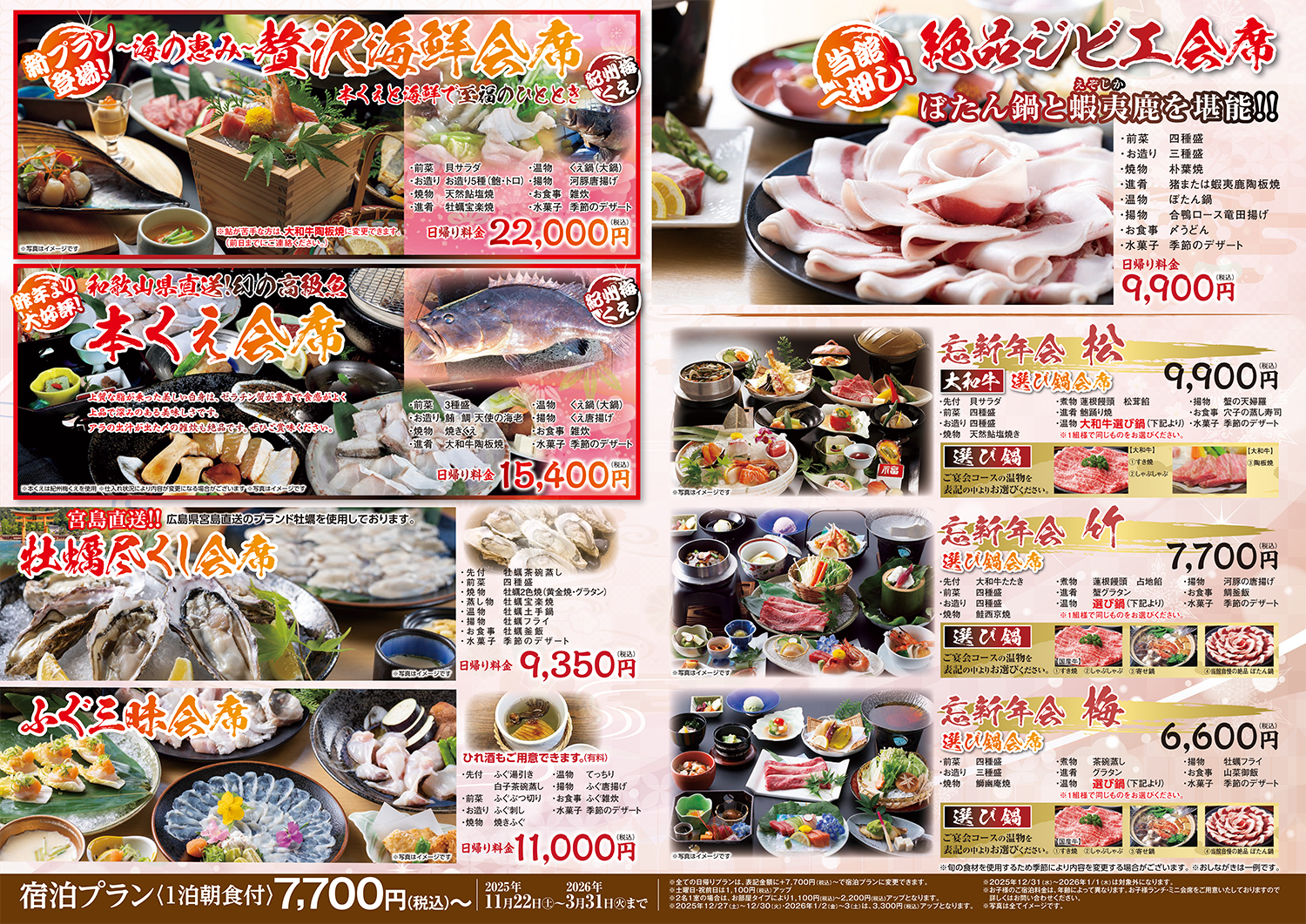 当館では、忘年会・新年会に合わせたプランをご用意しましたので、ぜひご検討くださいませ・